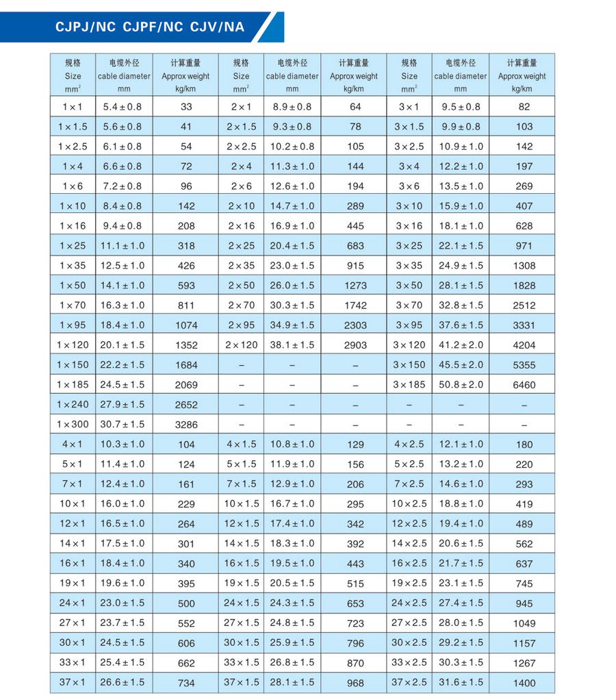 0.6/1kV CJPJ/NC CJPF/NC CJV/NA